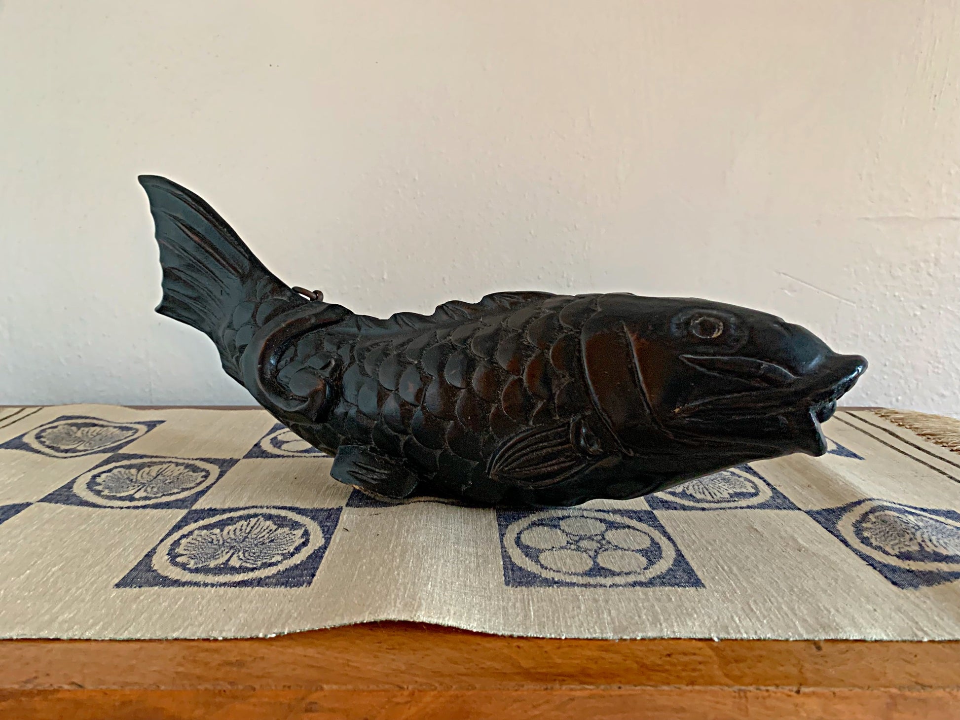 This stunning carved koi is known as a jizai kagi. This piece served a functional purpose in traditional Japanese homes as a hearth kettle hook used to suspend a kettle over an open fire. It is carved from a single piece of wood and features intricate detailing of the scales and a lifelike design. The tail has a twist and a flip at the end to indicate a swimming motion. Fish designs were used as charms to prevent fires, due to their association with water, and are also symbols of strength, perseverance, and good fortune in Japanese culture. A beautiful artwork and symbolic antique for a lucky home. It has an iron loop near the tail for hanging and a hole through the head for the chain for the kettle.