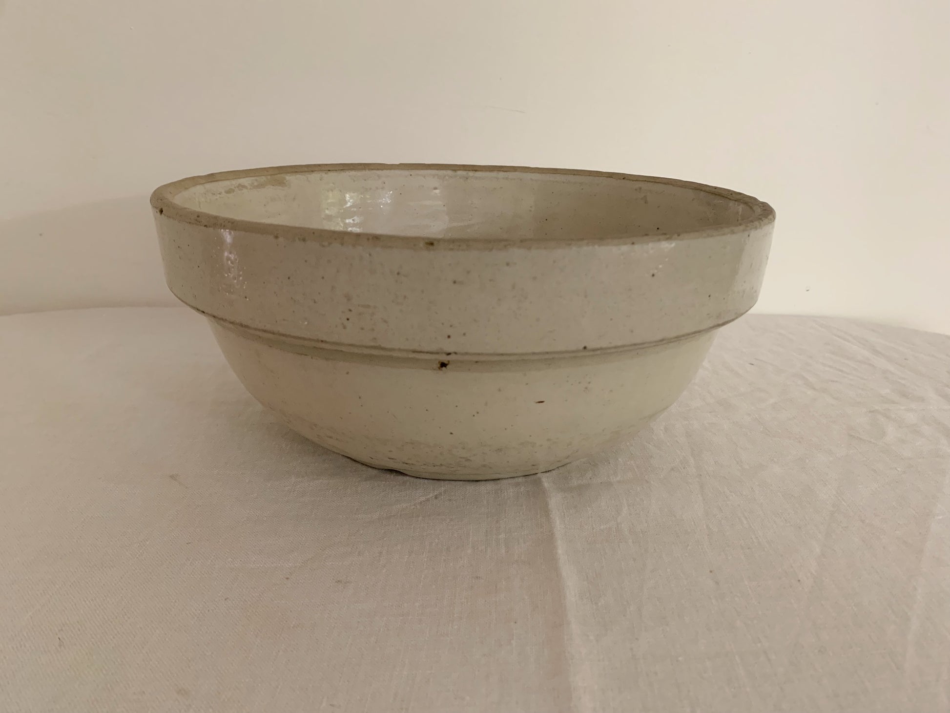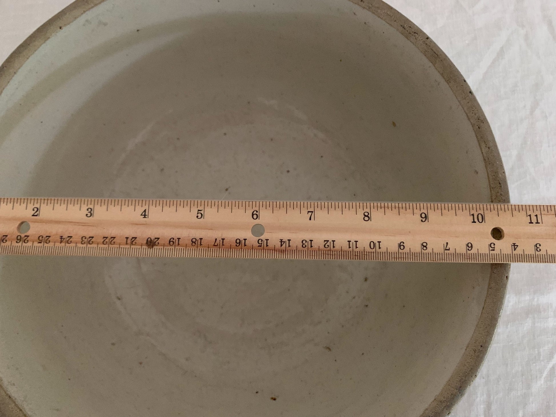 10.5" diameter. This gorgeous, antique bowl is the perfect primitive piece for any kitchen. The gray salt glaze looks cozy on the counter of a farmhouse kitchen or upscale and tasteful in a minimalist and modern kitchen. It is luxuriously thick with a wide band at the top. A beautiful piece of history.