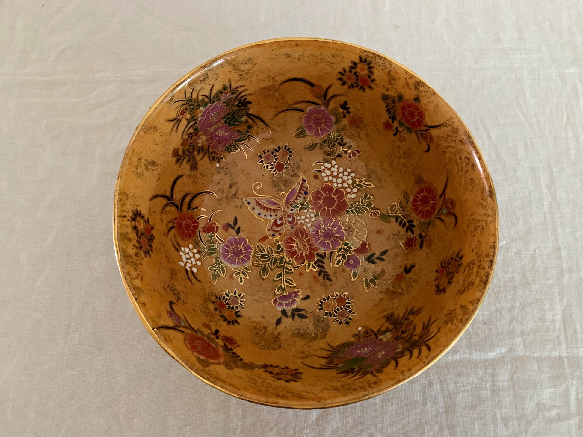 This huge, vintage bowl has stunning decoration both inside and out. Gorgeous flowers and butterflies abound; each element outlined in gold. Unusual to find a Satsuma bowl this large.