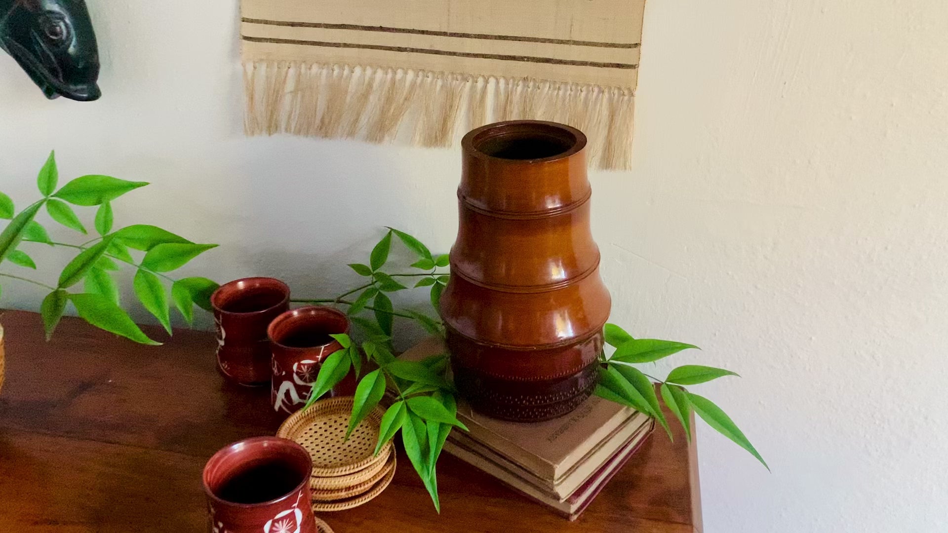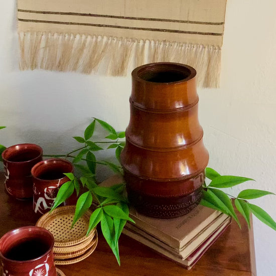 A beautiful piece of Japanese craftsmanship. This lightweight vase is made of wood and then carefully lacquered. It has a natural form with horizontal ribbing reminiscent of bamboo joints. The color has fluid variability; a bit darker at the base with a raised, dotted texture. It has an inner container which would protect it if used as a vase. A spectacular, sculptural item for your shelf or end table.