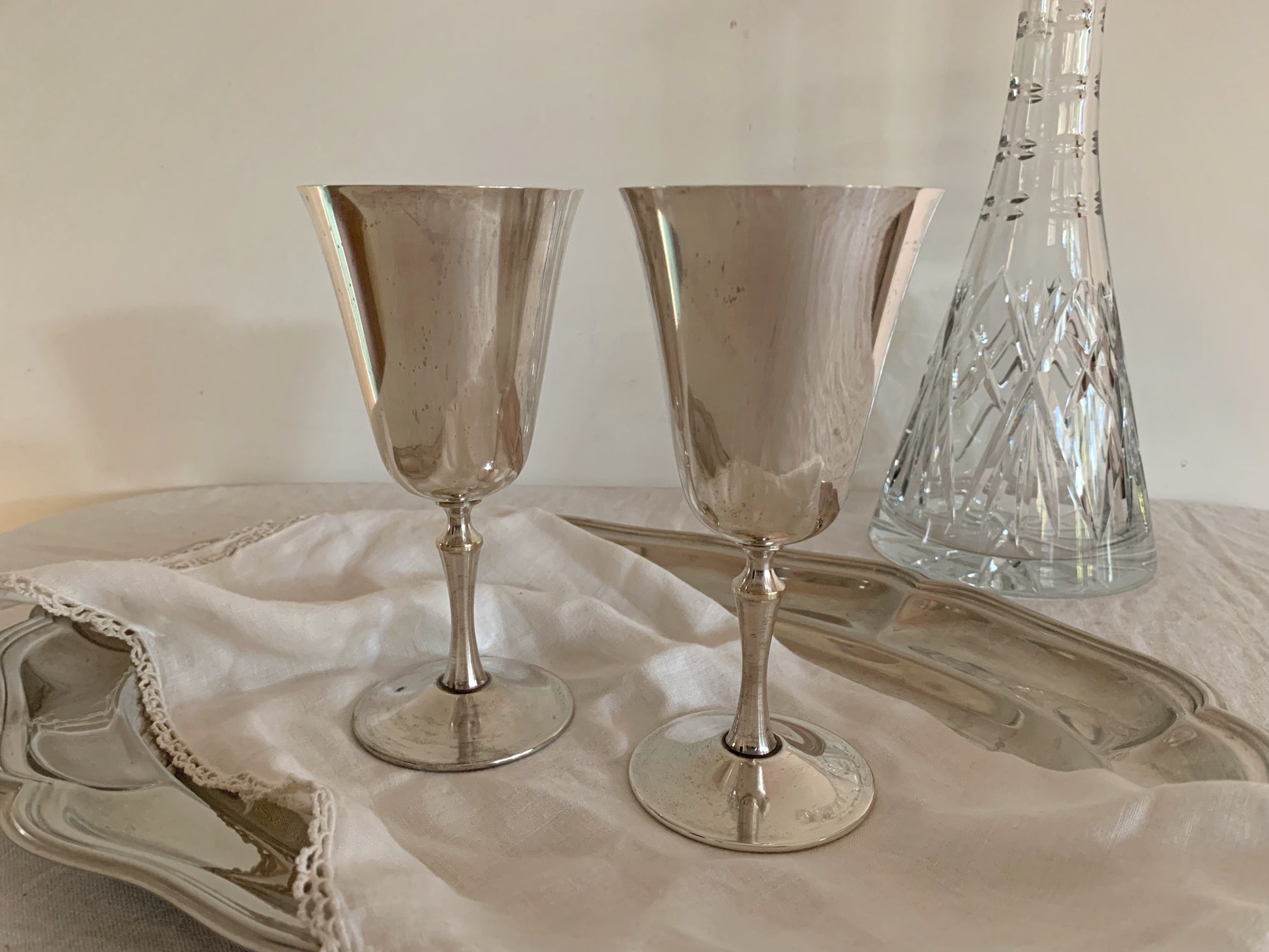 You will receive this pair of vintage silver goblets. By De Uberti Silver, Italy, these plated goblets have 1960s elgance.